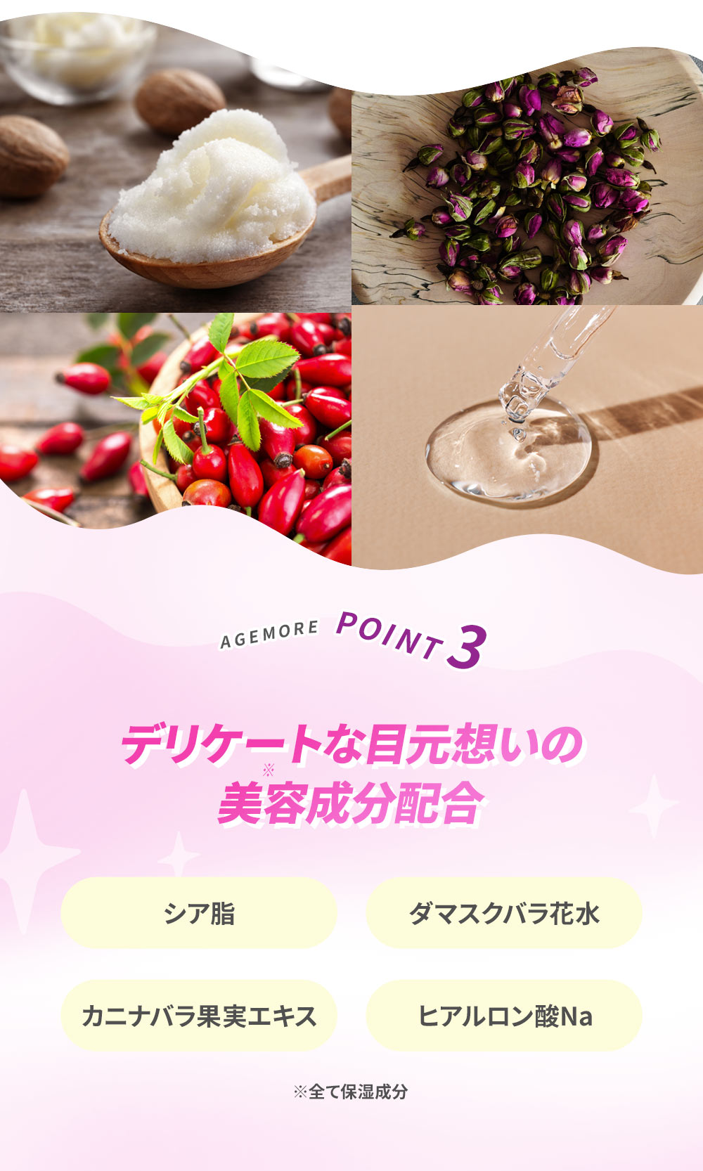 水、ポリブチレンテレフタレート、(エチレン/VA)コポリマー、アクリレーツコポリマー、グリセリン、BG、1,2-ヘキサンジオール、ポリソルベート60、フェノキシエタノール、(アクリロイルジメチルタウリンアンモニウム/VP)コポリマー、(アクリル酸ヒドロキシエチル/アクリロイルジメチルタウリンNa)コポリマー、カプリリルグリコール、イソステアリン酸ソルビタン、シア脂、ダマスクバラ花水、トリ(カプリル酸/カプリン酸)グリセリル、カニナバラ果実エキス、ヒアルロン酸Na、ヒアルロン酸クロスポリマーNa、ヒアルロン酸K、ヒアルロン酸ヒドロキシプロピルトリモニウム、加水分解ヒアルロン酸Na、加水分解ヒアルロン酸、ヒアルロン酸、アセチルヒアルロン酸Na
